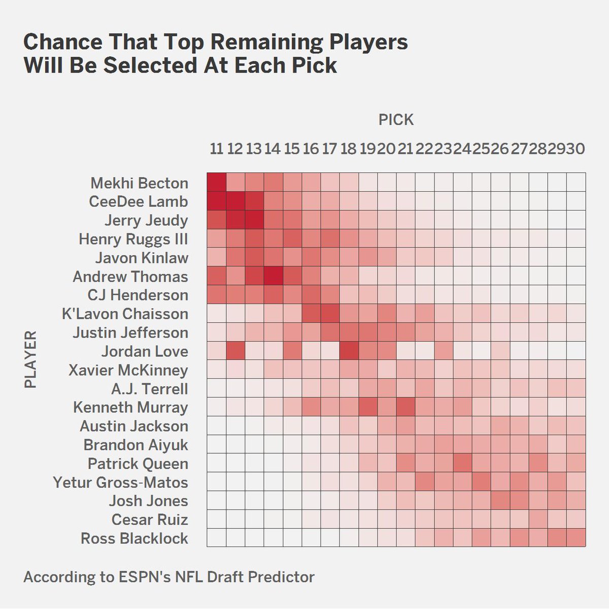 Seth Walder On Twitter I Realllly Like This Grid From Bmacgtpm Depicting The Probability Of The Top 20 Players Landing In Each Of The Top 20 Picks According To Espn S Nfl Draft