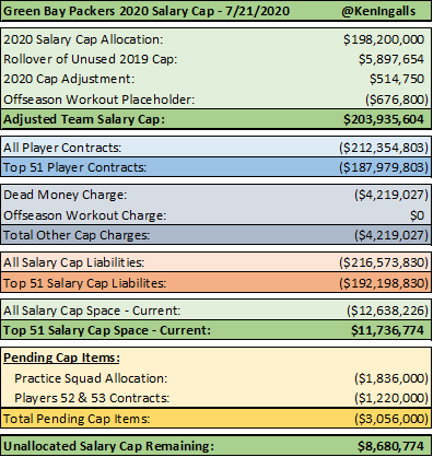 Space represents the maximum cap space a team will have when it signs at least 51 players to its roster for that season. Overthecap s jason fitzgerald a while back came up with an estimated figure of 7154 million over but that probably still includes goodwins 7 million from his old contract. For this i added another adjustment to the criteria above by just cutting every non qb on the roster that would save at least 500000 in net cap room.