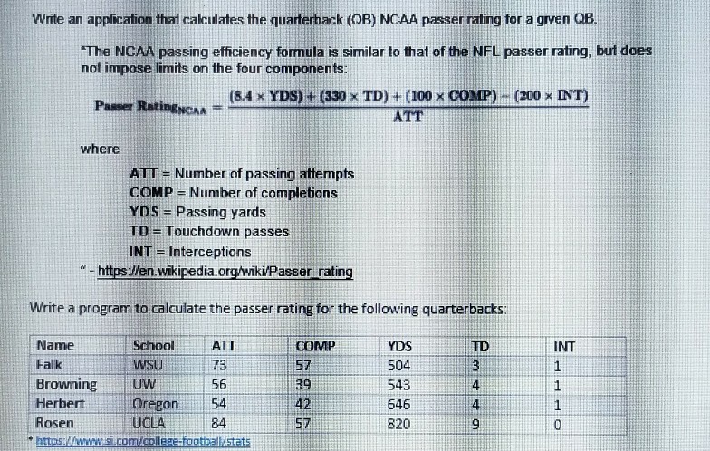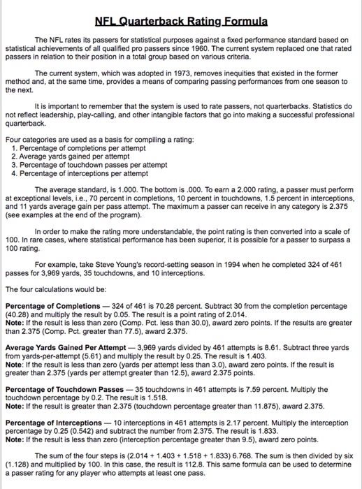Nfl passer rating formula. Nfl quarterback rating formula the nfl rates its passers for statistical purposes against a fixed performance standard based on statistical achievements of all qualified pro passers since 1960. Input your values below to calculate a rating. The highest possible passer rating possible using the nfls formula is 1583.