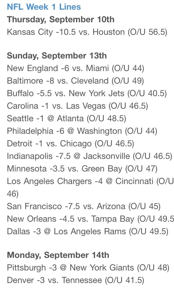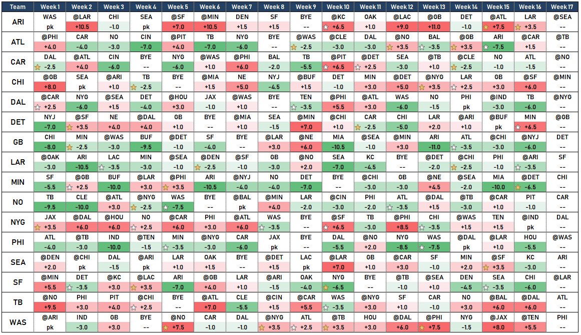Drew Dinsick On Twitter Current Week 1 And Lookahead Lines For All Nfl Games This Season Heat Map For Spread And Stars Indicate Right Wrong Side Of Key Numbers Https T Co Xtc4qzgftj